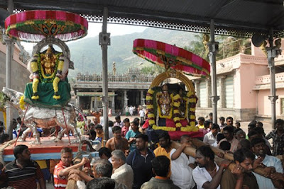 In the evenings all 5 Gods (i.e. Lord Shiva, Parashakti, Lord Ganesha, Lord Murugan and Chandikeswarar) begin their procession of the Temple Mada Veedhis. Starting from the Alankaram Mandapam (in front of the Raja Gopuram – East Gate) at approximately 10.30 p.m. It takes approximately 2-3 hours for the Panchamoorthies to perform circumambulation of the Temple Mada Veedhis.